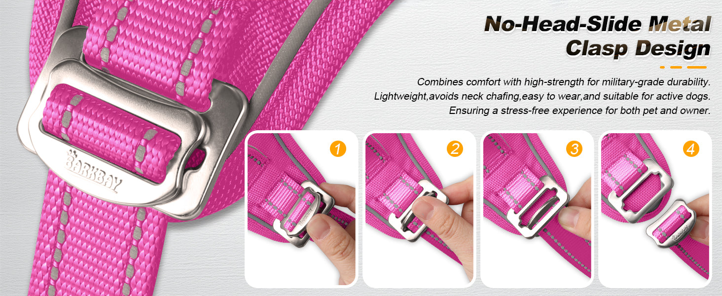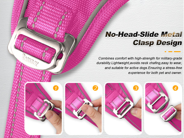 **Innovative No-Head-Slide Metal Clasp**: Combines comfort with high-strength for military-grade durability. Lightweight avoids neck chafing, easy to wear and suitable for sensitive or head-shy dogs, it avoids head discomfort, ensuring a secure fit without crossing over the head, enhances convenience and ease