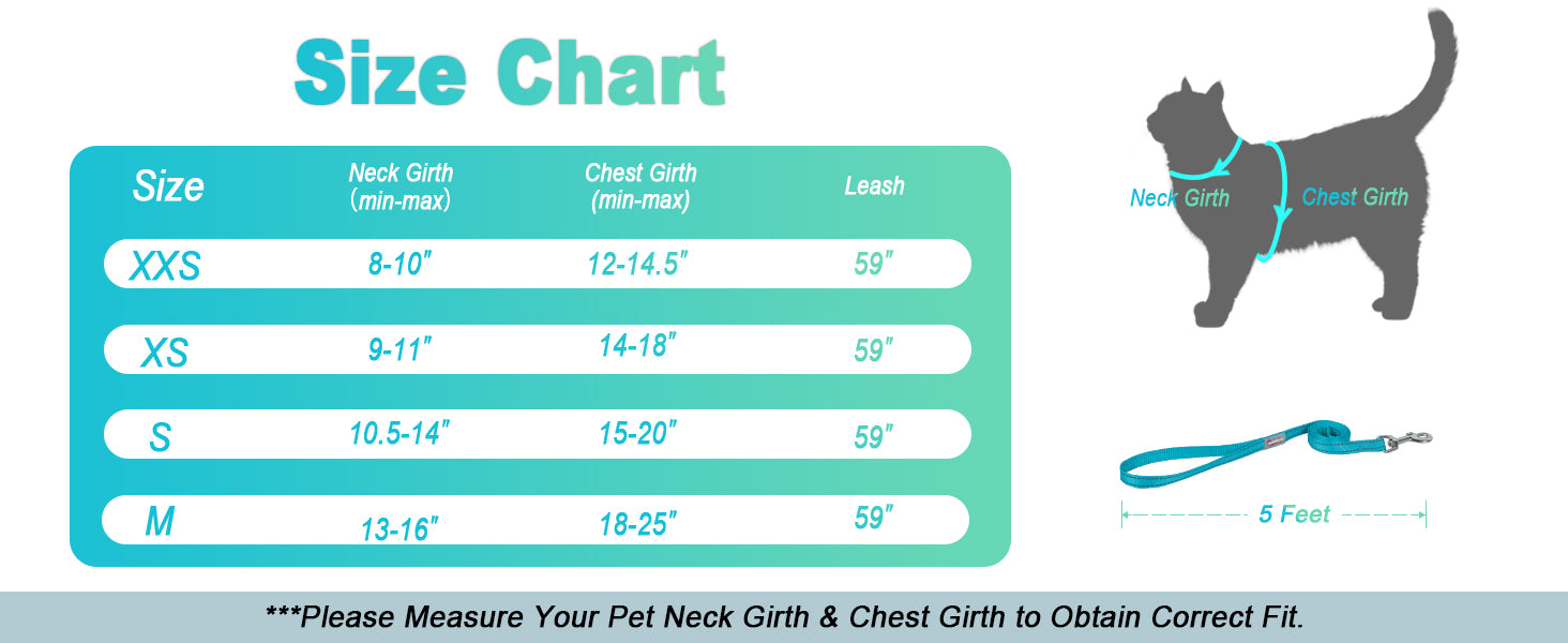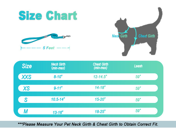 Important: For the best fit, we recommend measuring your cat’s neck and chest before purchasing. This ensures the harness will provide the snug and secure fit that keeps your cat comfortable while preventing escape.