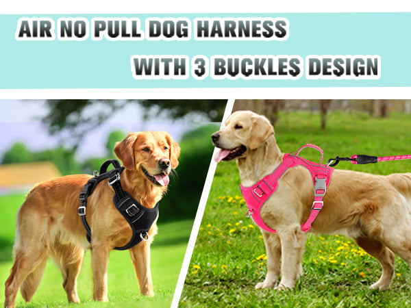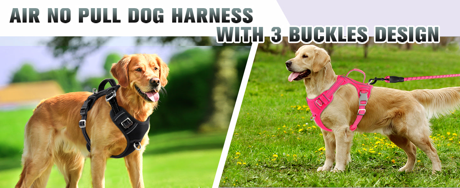 The Air No-Pull Dog Harness is custom-designed for active dogs love outdoor adventures like running and hiking with people. No Pull Design corrects the dog's pulling instinct by reorienting its pull to the side.3-Buckle design, no need to slip over dog’s head, Making it easy to put on and take off