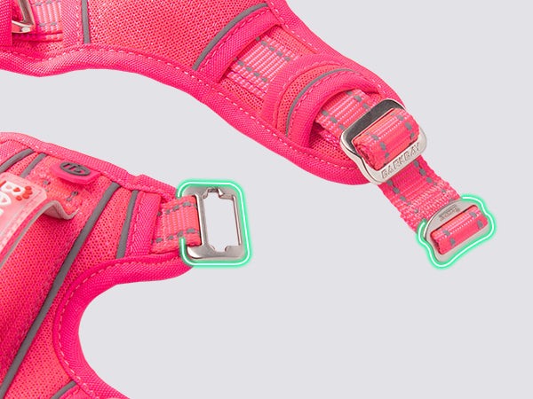 Pre-adjust the harness with metal adjusters to the approximate size of your dog's girth.